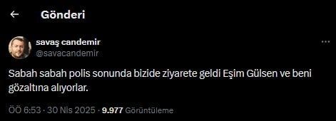 Eğitim Sen İzmir 5 No’lu Şube Başkanı Savaş Candemir, X hesabından yaptığı paylaşım ile kendisi ve eşi Gülsen Candemir’in gözaltına alındığını duyurdu.