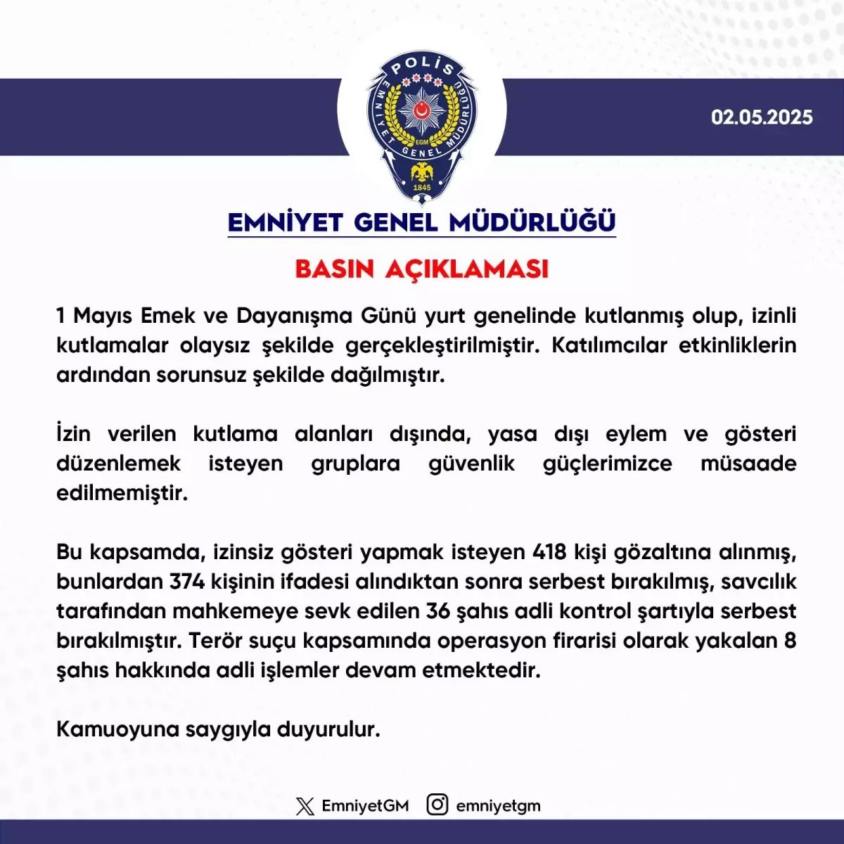 Emniyet Genel Müdürlüğü sosyal medya hesabından yapılan paylaşımda, “1 Mayıs Emek ve Dayanışma Günü yurt genelinde kutlanmış olup, izinli kutlamalar olaysız şekilde gerçekleştirilmiştir. Katılımcılar etkinliklerin ardından sorunsuz şekilde dağılmıştır. İzin verilen kutlama alanları dışında, yasa dışı eylem ve gösteri düzenlemek isteyen gruplara güvenlik güçlerimizce müsaade edilmemiştir. Bu kapsamda, izinsiz gösteri yapmak isteyen 418 kişi gözaltına alınmış, bunlardan 374 kişinin ifadesi alındıktan sonra serbest bırakılmış, savcılık tarafından mahkemeye sevk edilen 36 şahıs adli kontrol şartıyla serbest bırakılmıştır. Terör suçu kapsamında operasyon firarisi olarak yakalan 8 şahıs hakkında adli işlemler devam etmektedir” ifadeleri kullanıldı.