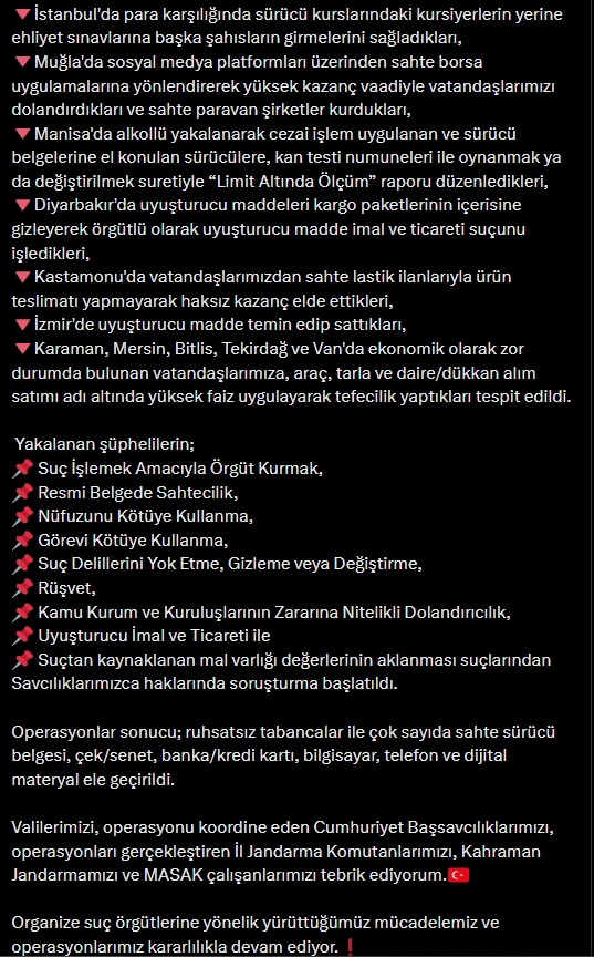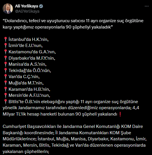 Yerlikaya'nın sosyal medya hesabından yapılan paylaşım şu şekilde:
