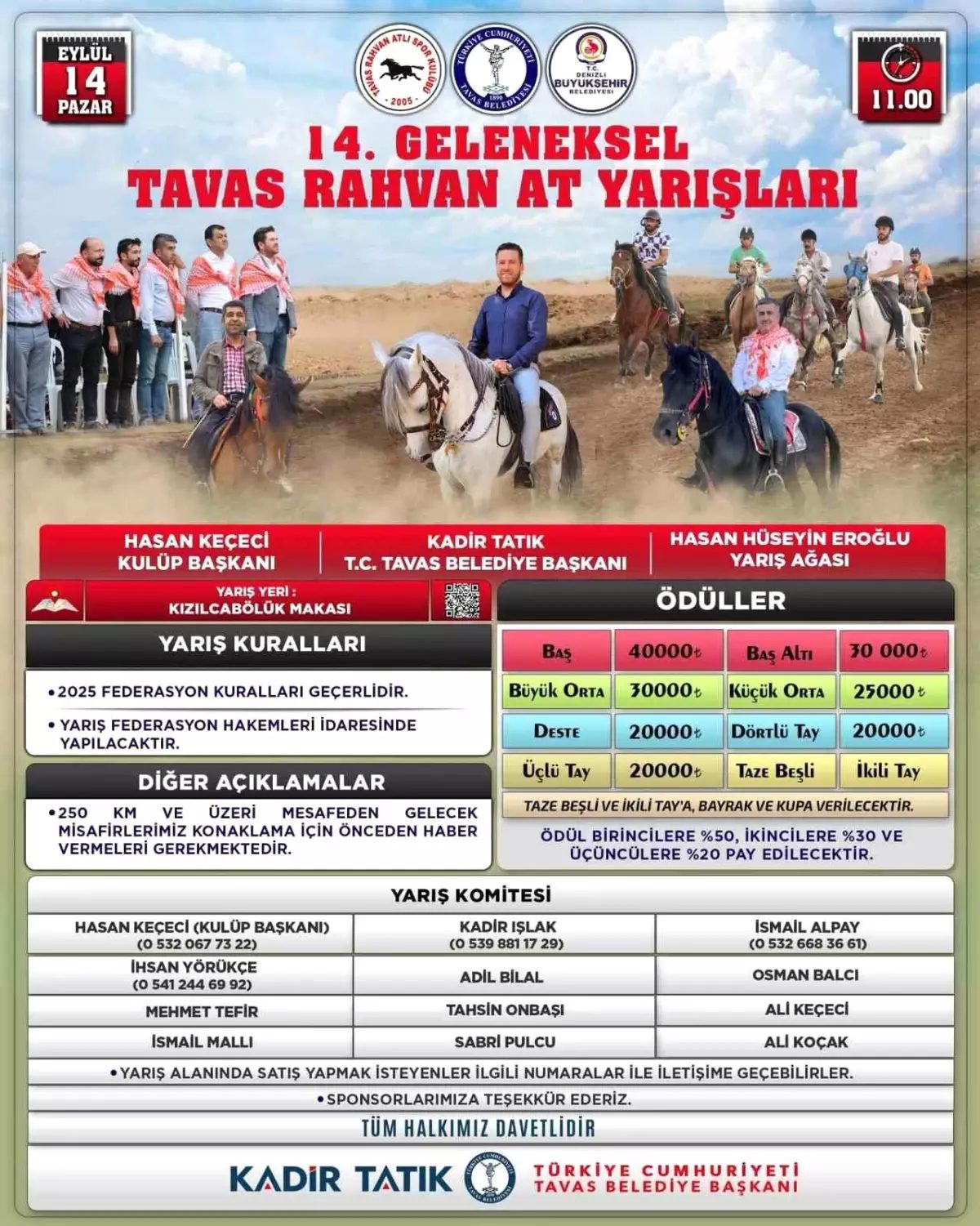 14.’üncü Tavas Rahvan At Yarışı, Tavas Belediyesi, Türkiye Geleneksel Atlı Spor Dalları Federasyonu ve Tavas Rahvan At Yarışçıları ve Yetiştiricileri Yardımlaşma Derneği iş birliği ile 14 Eylül Pazar günü gerçekleştirilecek. Tavas Ovası, Türkiye’nin birçok İlinden gelen atçılara ev sahipliği yapacak. Büyük heyecanın yaşanacağı yarışlarda, baş, başaltı, büyük orta, küçük orta, deste, 4’lü tay, 3’lü tay ve taze 5’li kategorilerinde dereceye giren binicilere ödüller takdim edilecek.