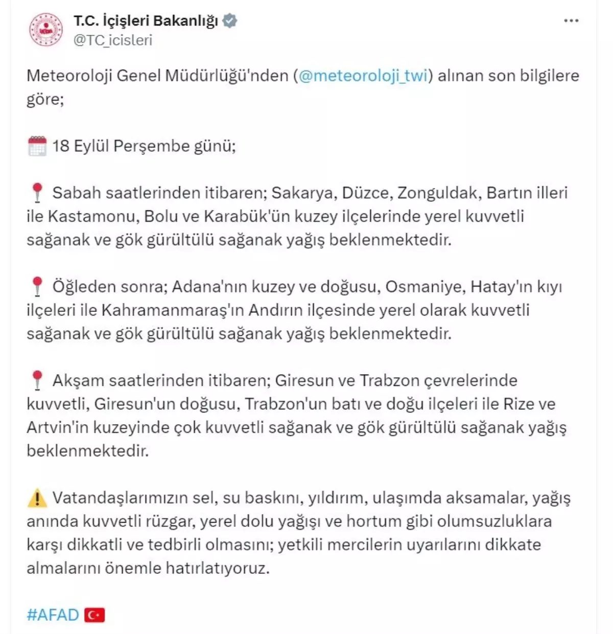 Bakanlığın sosyal medya hesabından yapılan açıklamada, ” Meteoroloji Genel Müdürlüğü’nden alınan son bilgilere göre; 18 Eylül Perşembe günü; sabah saatlerinden itibaren; Sakarya, Düzce, Zonguldak, Bartın illeri ile Kastamonu, Bolu ve Karabük’ün kuzey ilçelerinde yerel kuvvetli sağanak ve gök gürültülü sağanak yağış beklenmektedir. Öğleden sonra; Adana’nın kuzey ve doğusu, Osmaniye, Hatay’ın kıyı ilçeleri ile Kahramanmaraş’ın Andırın ilçesinde yerel olarak kuvvetli sağanak ve gök gürültülü sağanak yağış beklenmektedir. Akşam saatlerinden itibaren; Giresun ve Trabzon çevrelerinde kuvvetli, Giresun’un doğusu, Trabzon’un batı ve doğu ilçeleri ile Rize ve Artvin’in kuzeyinde çok kuvvetli sağanak ve gök gürültülü sağanak yağış beklenmektedir. Vatandaşlarımızın sel, su baskını, yıldırım, ulaşımda aksamalar, yağış anında kuvvetli rüzgar, yerel dolu yağışı ve hortum gibi olumsuzluklara karşı dikkatli ve tedbirli olmasını; yetkili mercilerin uyarılarını dikkate almalarını önemle hatırlatıyoruz” denildi.