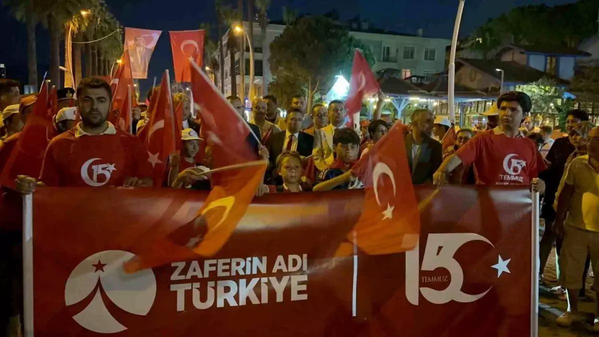 Akşam saatlerinde 15 Temmuz Demokrasi Meydanı’ndan başlayan Milli Birlik araç kortejinin ardından yapılan yürüyüş ellerde Türk bayraklarıyla Marmaris Atatürk Meydanı’na kadar sürdü. Meydandaki törende, Muğla İl Müftüsü tarafından Kur’an-ı Kerim okundu. Ardından Muğla milletvekilleri ve Muğla Valisi İdris Akbıyık günün anlam ve önemini belirten konuşmalar yaptı. Cumhurbaşkanı Recep Tayyip Erdoğan’ın 15 Temmuz’a ilişkin video mesajı da dev ekrandan katılımcılara izletildi.