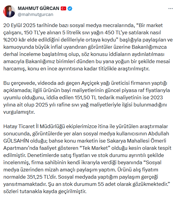 20 Eylül’de sosyal medyada yayılan videoda bir market çalışanı, 150 liralık ayçiçek yağının 450 liraya satıldığını iddia eden bir video çekti. Yayılan video Ticaret Bakanlığı’nın dikkatini çekti ve gerçekliği araştırıldı. Bakanlık birimleri videonun çekildiği marketi araştırmaya başladı ve bu arada yağın üreticisiyle de görüşüldü. Yağ üreticisi açıklama yaparak ilgili ürünün bayi maliyetlerinin güncel piyasa raf fiyatlarıyla uyumlu olduğunu, iddia edilen 151,50 TL tedarik maliyetinin ise 2023 yılına ait olup 2025 yılı rafine sıvı yağ maliyetleriyle ilgisi bulunmadığını vurguladı.