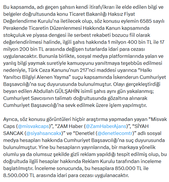 Bakan Yardımcısı Gürcan, bu aşamadan sonra konunun yasal işlemle tabi tutulacağını belirterek, “Konu Ticaret Bakanlığı Haksız Fiyat Değerlendirme Kurulu’na iletilecek olup, söz konusu eylemin 6585 sayılı Perakende Ticaretin Düzenlenmesi Hakkında Kanun kapsamında stokçuluk ve piyasa dengesi ile serbest rekabeti bozucu fiil olarak değerlendirilmesi halinde, ilgili şahıs hakkında 1 milyon 400 bin TL ile 17 milyon 200 bin TL arasında değişen tutarlarda idari para cezası uygulanacaktır” dedi.