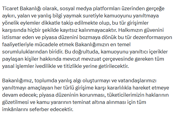Gürcan açıklamasında şu uyarıda da bulundu: “Bakanlığımız, toplumda yanlış algı oluşturmayı ve vatandaşlarımızı yanıltmayı amaçlayan her türlü girişime karşı kararlılıkla hareket etmeye devam edecek; piyasa düzeninin korunması, tüketicilerimizin haklarının gözetilmesi ve kamu yararının teminat altına alınması için tüm imkânlarını seferber edecektir.”