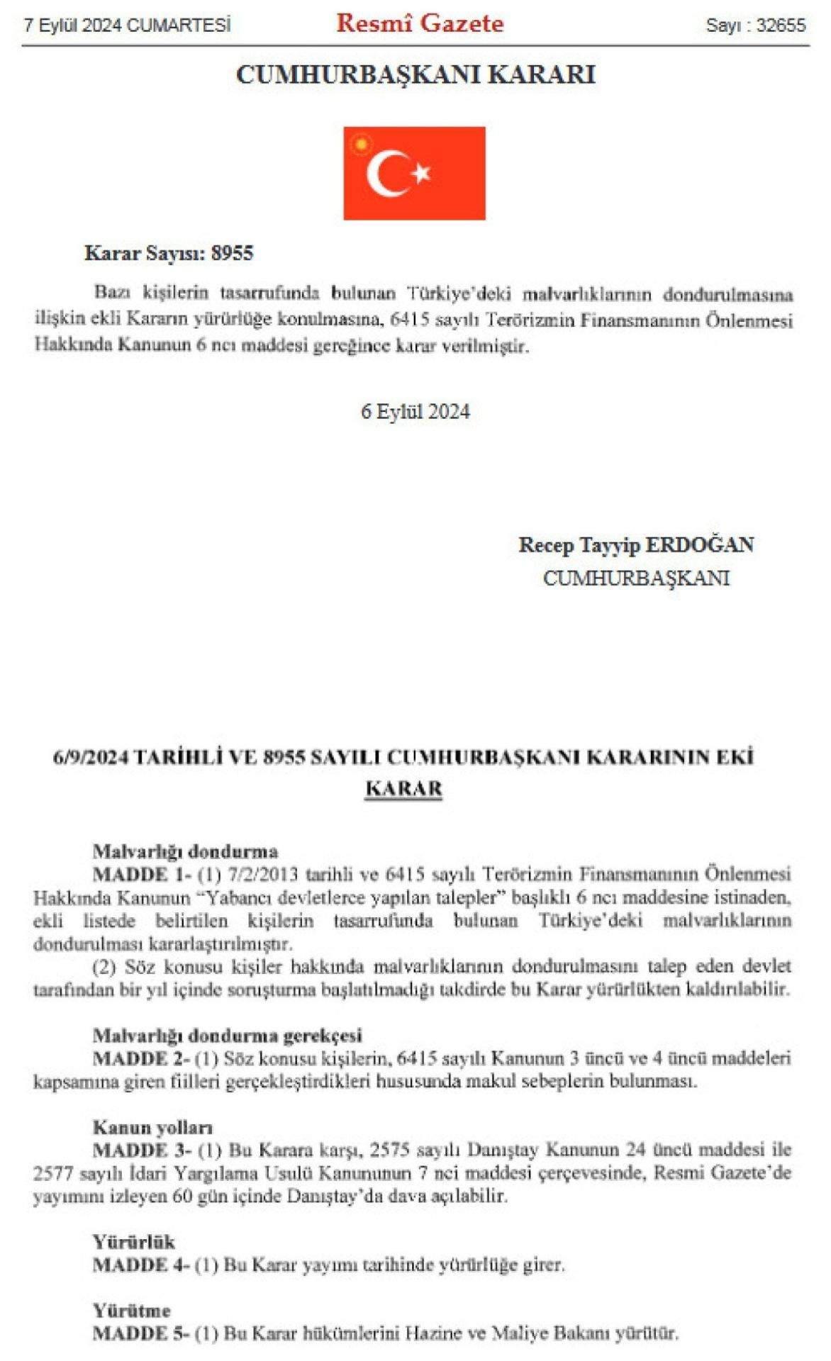 Cumhurbaşkanı Recep Tayyip Erdoğan’ın imzasıyla yayımlanan kararın, terörizmin finansmanının önlenmesi hakkındaki kanunun “Yabancı devletlerce yapılan talepler” maddesine istinaden alındığı ifade edildi.