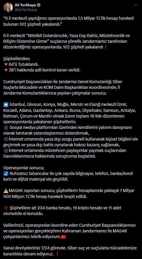 İçişleri Bakanı Ali Yerlikaya, sosyal medya hesabından yaptığı açıklamada, siber suçlara yönelik 6 il merkezli ve 18 ili kapsayan geniş çaplı operasyonlarda toplam 102 şüphelinin yakalandığını duyurdu. Operasyon kapsamında şüphelilerin 7,5 milyar TL’lik yasa dışı hesap hareketi tespit edildi.