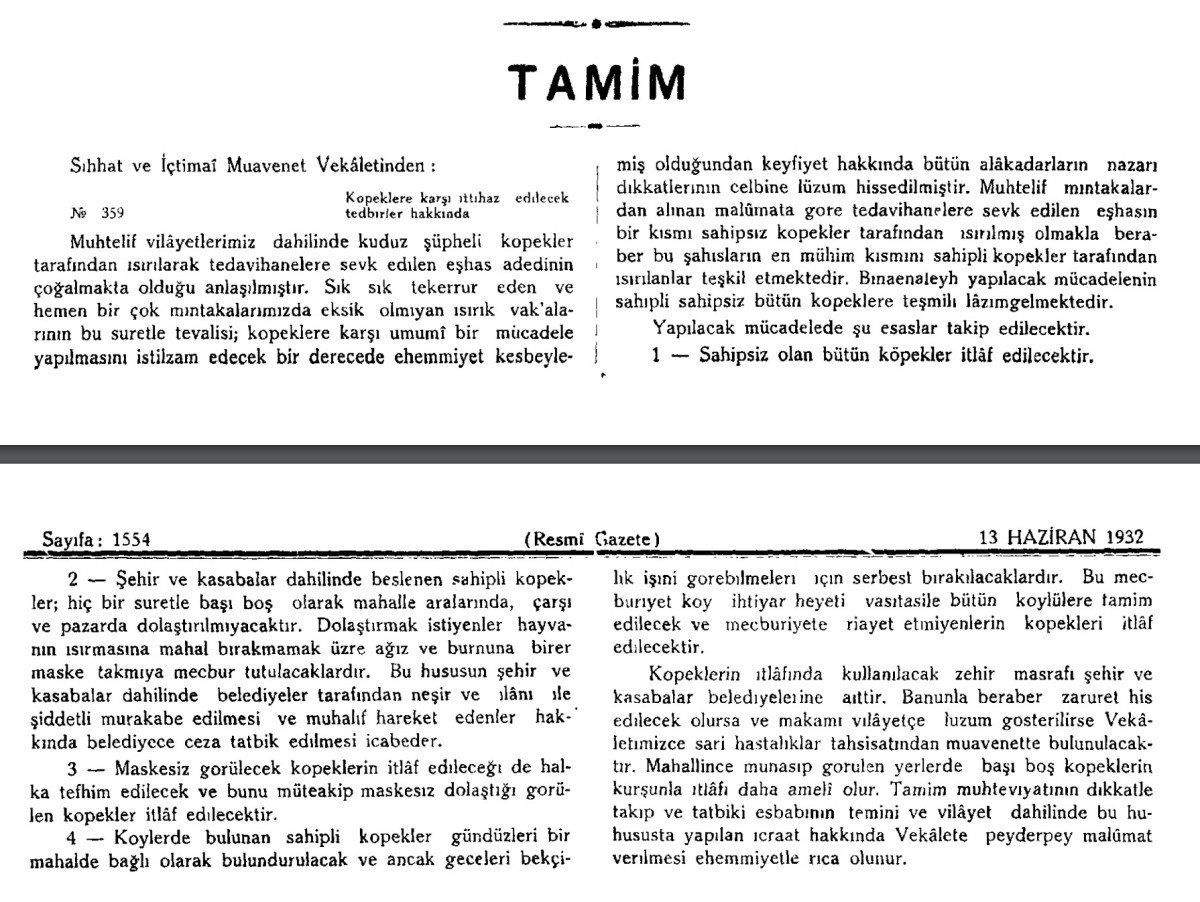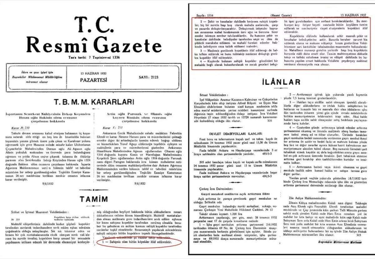 Resmi Gazete’de 13 Haziran 1932 tarihinde yayınlanan genelgeye göre hükümetin, “sahipsiz ve maskesiz dolaşan köpeklerin itlaf edilmesini” kararlaştırdığı görülüyor.