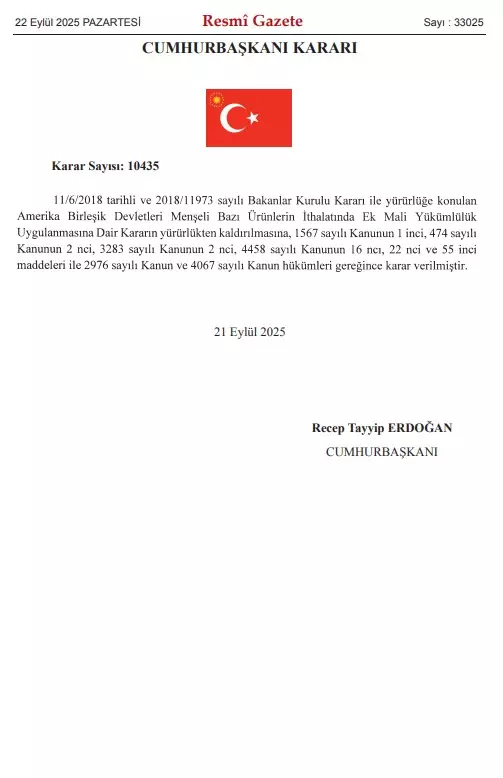 Bazı ABD ürünlerine uygulanan ek mali yükümlülükler Resmi Gazete’de yayımlanan Cumhurbaşkanlığı kararıyla kaldırıldı.