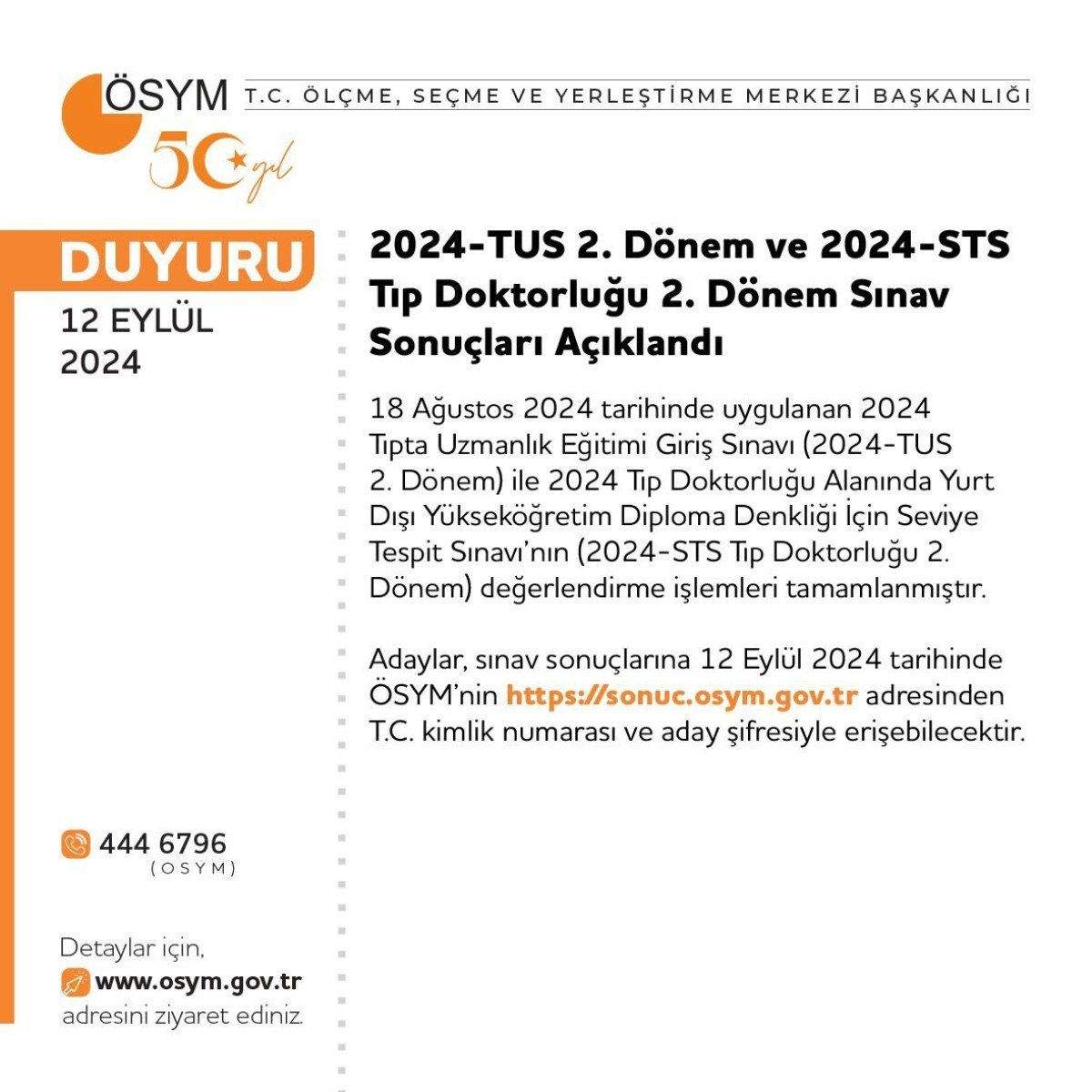 Ölçme, Seçme ve Yerleştirme Merkezi, 2024-TUS 2. Dönem ve 2024-STS Tıp Doktorluğu 2. Dönem sınav sonuçlarının açıklandığını duyurdu.