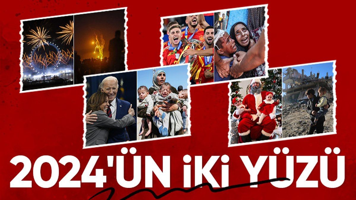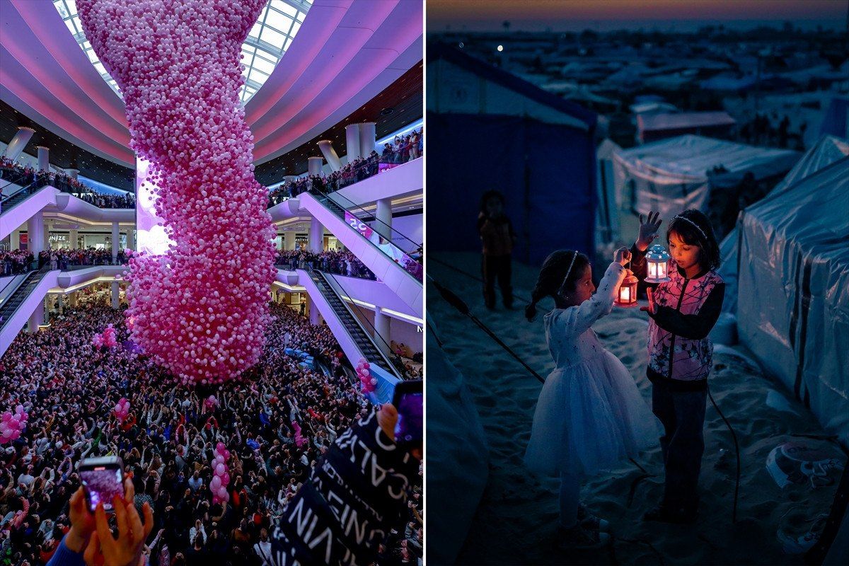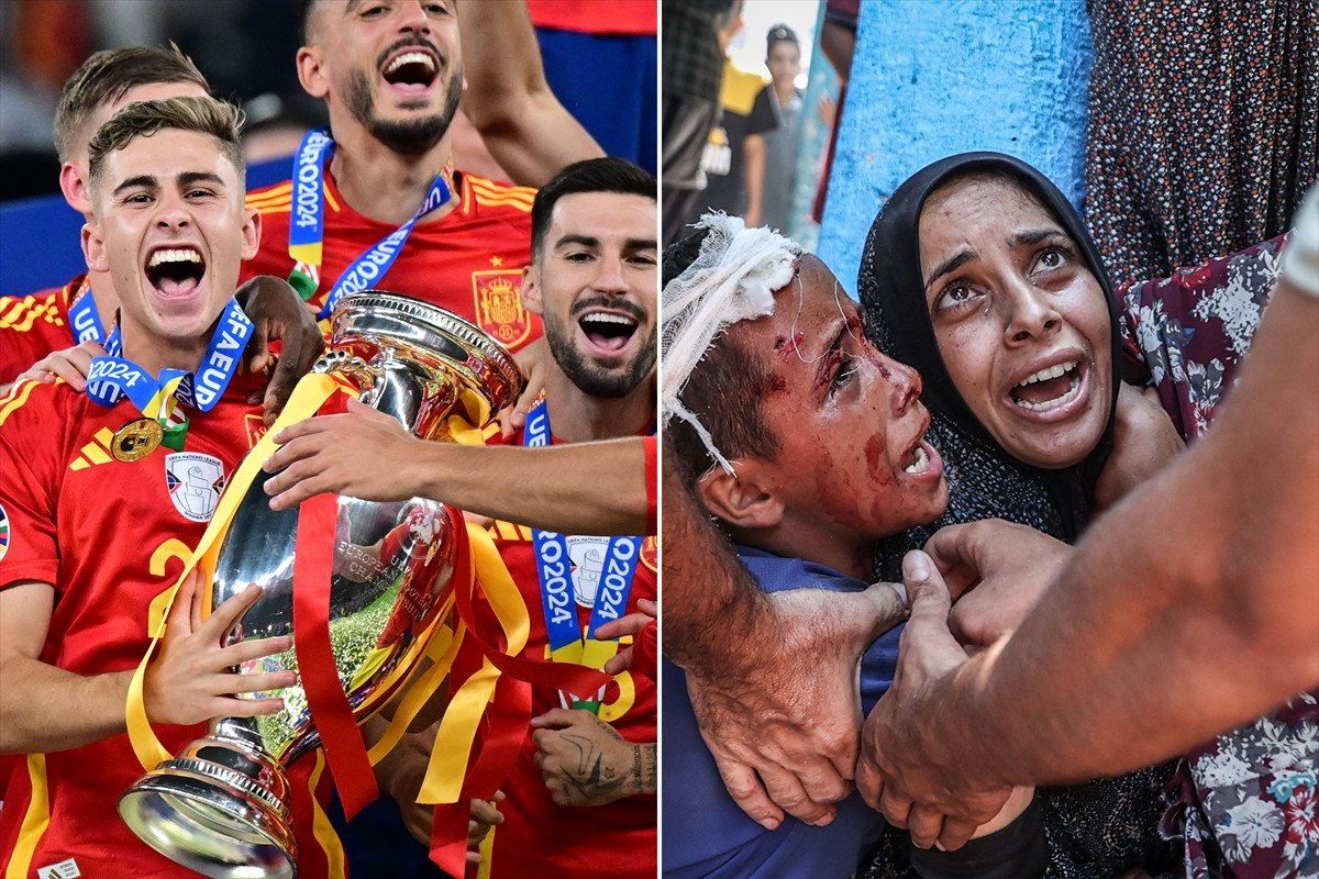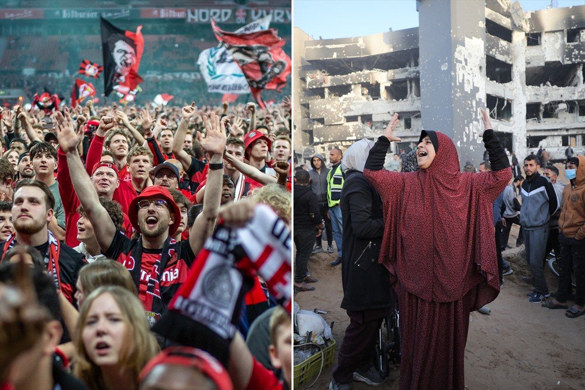 Dünyanın iki farklı yüzünü yansıtan kolajda, bir yanda Batı ülkelerindeki etkinlikler diğer tarafta ise İsrail saldırılarının acı tablosu yer aldı.