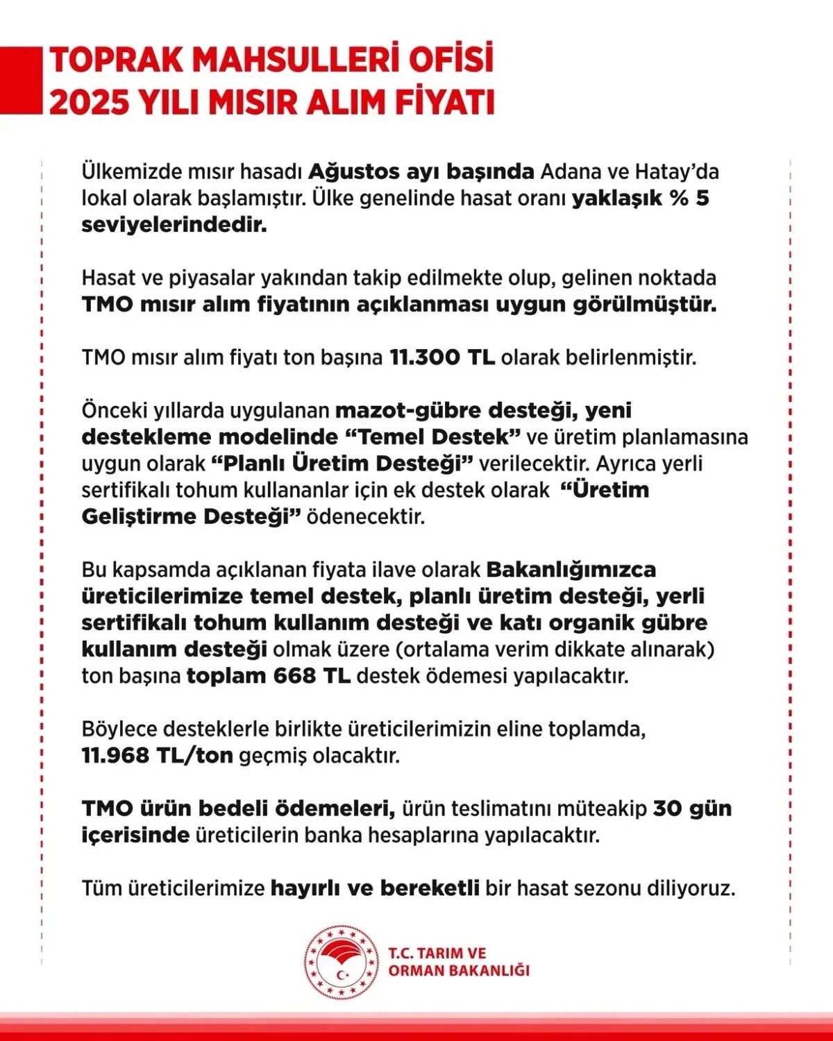 “Ülkemizde mısır hasadı Ağustos ayı başında Adana ve Hatay’da lokal olarak başlamıştır. Ülke genelinde hasat oranı yaklaşık yüzde 5 seviyelerindedir. Hasat ve piyasalar yakından takip edilmekte olup, gelinen noktada Toprak Mahsulleri Ofisi mısır alım fiyatının açıklanması uygun görülmüştür. Toprak Mahsulleri Ofisi mısır alım fiyatı ton başına 11 bin 300 lira olarak belirlenmiştir. Önceki yıllarda uygulanan mazot-gübre desteği, yeni destekleme modelinde ‘Temel Destek’ ve üretim planlamasına uygun olarak ‘Planlı Üretim Desteği’ verilecektir. Ayrıca yerli sertifikalı tohum kullananlar için ek destek olarak ‘Üretim Geliştirme Desteği’ ödenecektir. Bu kapsamda açıklanan fiyata ilave olarak Bakanlığımızca üreticilerimize temel destek, planlı üretim desteği, yerli sertifikalı tohum kullanım desteği ve katı organik gübre kullanım desteği olmak üzere (ortalama verim dikkate alınarak) ton başına toplam 668 lira destek ödemesi yapılacaktır. Böylece desteklerle birlikte üreticilerimizin eline toplamda, 11 bin 968 lira/ton geçmiş olacaktır. Toprak Mahsulleri Ofisi ürün bedeli ödemeleri, ürün teslimatını müteakip 30 gün içerisinde üreticilerin banka hesaplarına yapılacaktır. Tüm üreticilerimize hayırlı ve bereketli bir hasat sezonu diliyoruz.” – ANKARA