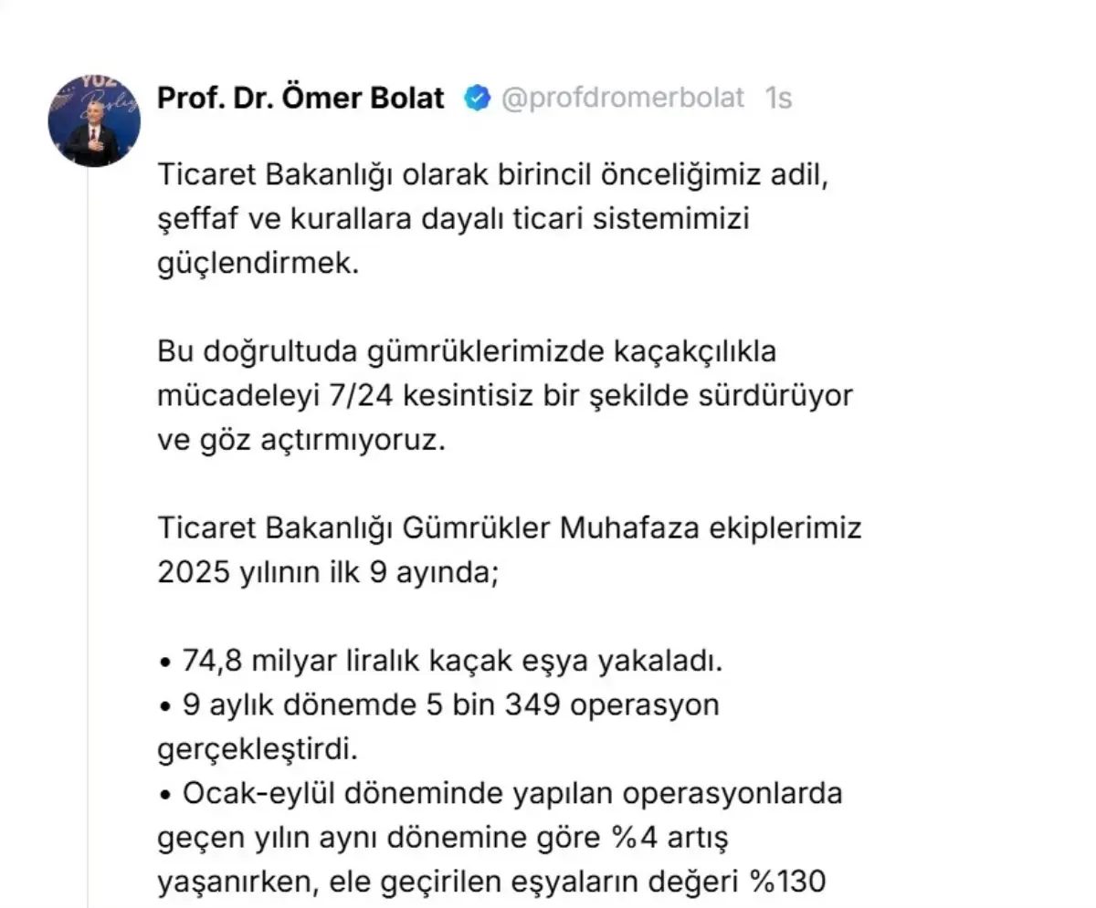 TİCARET Bakanı Ömer Bolat, 2025 yılının ilk 9 ayında 74,8 milyar liralık kaçak eşya ele geçirildiğini duyurdu.