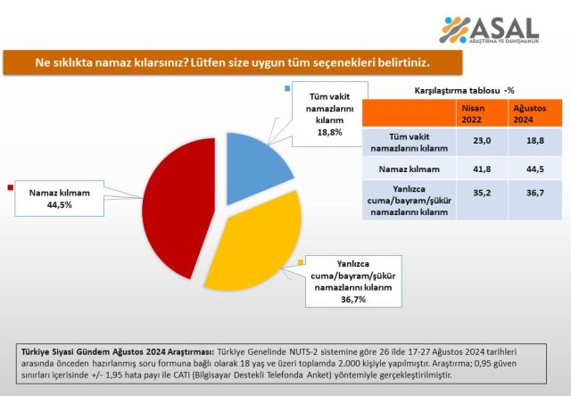 Asal Araştırma, Nisan 2022 ve Ağustos 2024’de yaptığı “Ne sıklıkta namaz kılarsınız?” başlıklı anket çalışmasını paylaştı. 26 ilde 2 bin kişiyle yapılan ankete göre, Nisan 2022’de “Tüm vakit namazlarını kılarım” oranı yüzde 23 iken Ağustos 2024’de bu oran yüzde 18,8’e düştü. Aynı ankette, ‘Namaz kılmam’ yanıtı 2022 yılında yüzde 41,8 olduğu görülürken, 2024 yılında yüzde 44,5 oranına yükseldi.