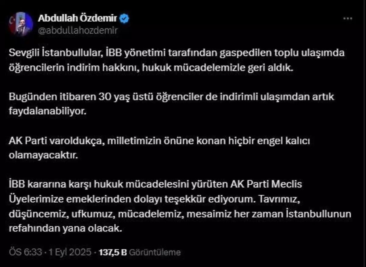 AK Parti İstanbul İl Başkanı Abdullah Özdemir, İBB tarafından iptal edilen 30 yaş üstü öğrencilerin indirimli ulaşım hakkını hukuk mücadelesinin ardından geri aldıklarını duyurdu.
