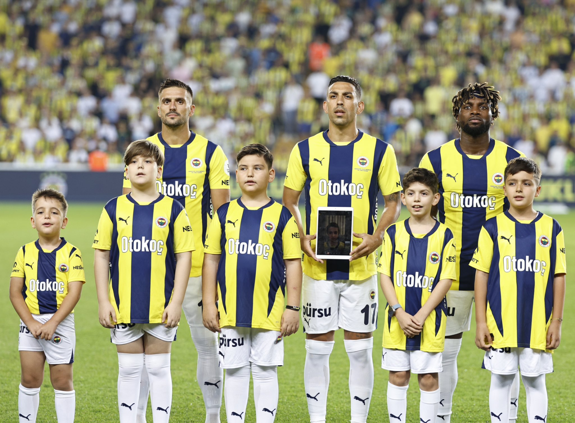 Karşılaşma başlamadan forma, şort ve konçları ile hazır bulunan çocuklar, futbolcular ile el ele sahaya çıkacak.