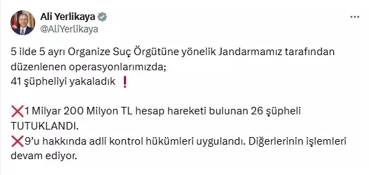 İçişleri Bakanı Ali Yerlikaya, jandarma tarafından düzenlenen suç örgütü operasyonunu sosyal medya hesabından paylaştı.