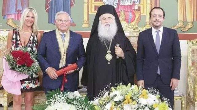 Türkiye karşıtı Menendez, Kıbrıs Rum Ortodoks Kilisesi’den Rumların mücadelelerine katkı ve “Helenizm”e hizmetlerinden dolayı Havari Barnabas Altın Madalyası almıştı.