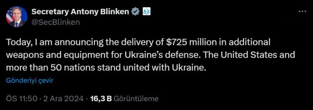 Blinken, sosyal medya hesabından yaptığı duyuruda şu ifadeleri kullandı: “Bugün, Ukrayna’nın savunması için 725 milyon dolarlık ek silah ve teçhizat teslimatını duyuruyorum. Amerika Birleşik Devletleri ve 50’den fazla ülke Ukrayna ile birleşmiş durumda.”