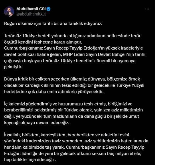 “Bugün ülkemiz için tarihi bir ana tanıklık ediyoruz. Terörsüz Türkiye hedefi yolunda attığımız adımların neticesinde terör örgütü kendini feshetme kararı almıştır.