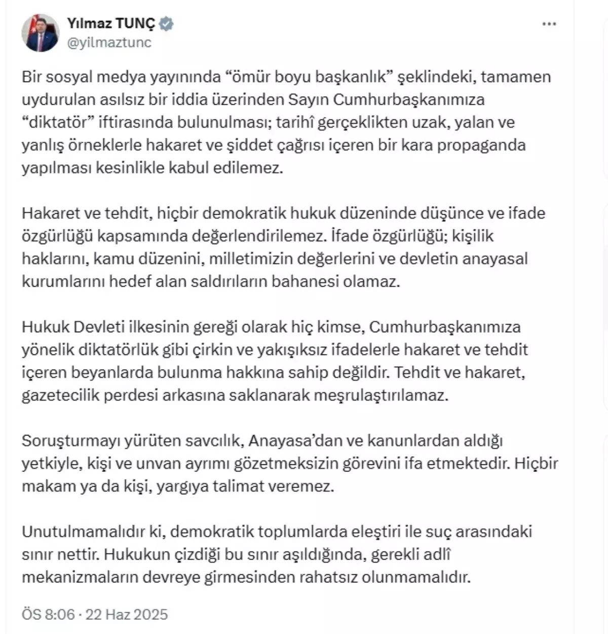 Bakan Tunç, Hukuk Devleti ilkesinin gereği olarak hiç kimse, Cumhurbaşkanı Erdoğan’a yönelik diktatörlük gibi çirkin ve yakışıksız ifadelerle hakaret ve tehdit içeren beyanlarda bulunma hakkına sahip olmadığını belirterek, “Tehdit ve hakaret, gazetecilik perdesi arkasına saklanarak meşrulaştırılamaz. Soruşturmayı yürüten savcılık, Anayasa’dan ve kanunlardan aldığı yetkiyle, kişi ve unvan ayrımı gözetmeksizin görevini ifa etmektedir. Hiçbir makam ya da kişi, yargıya talimat veremez. Unutulmamalıdır ki, demokratik toplumlarda eleştiri ile suç arasındaki sınır nettir. Hukukun çizdiği bu sınır aşıldığında, gerekli adli mekanizmaların devreye girmesinden rahatsız olunmamalıdır” ifadelerini kullandı.