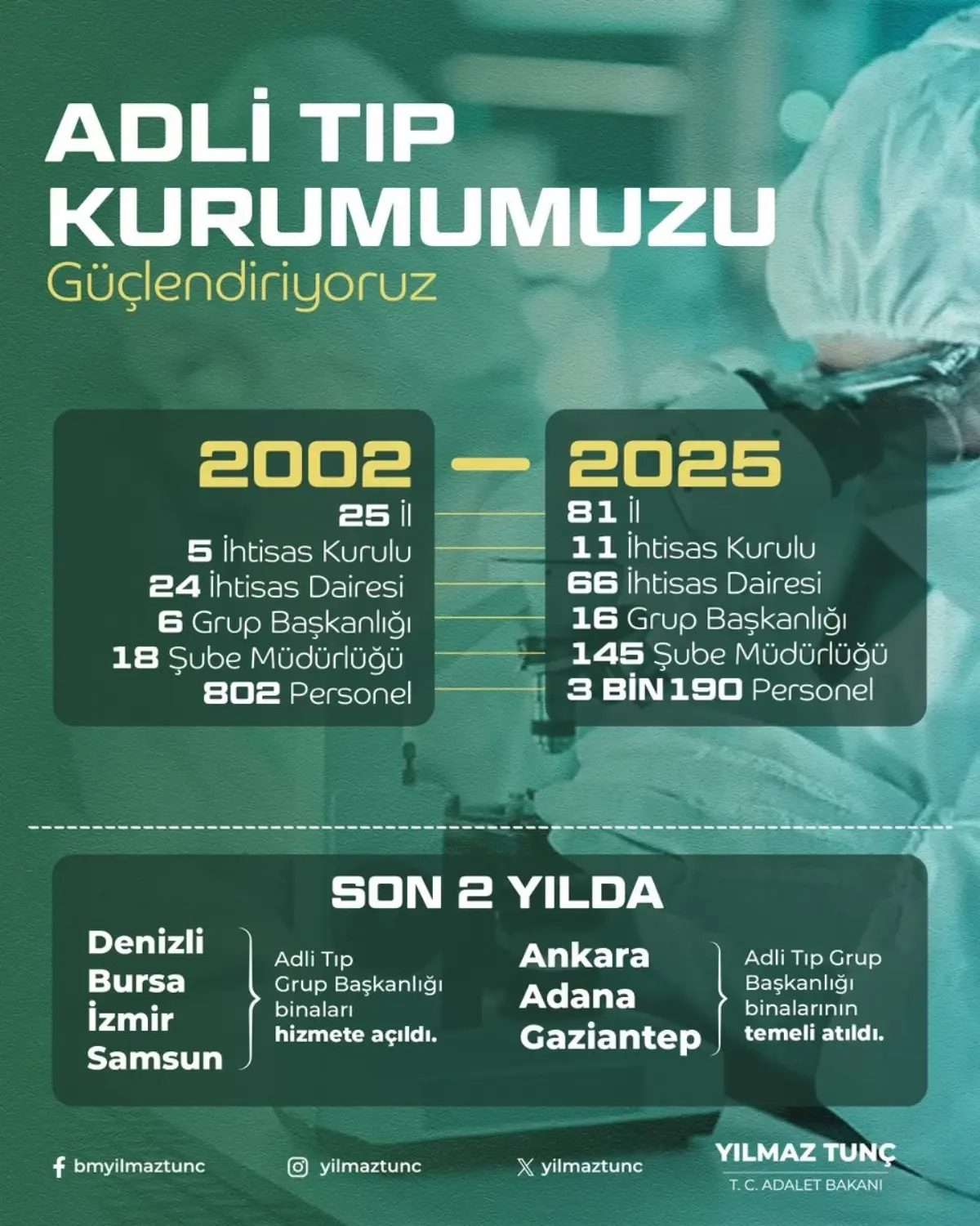 Bakan Tunç’un paylaştığı infografiğe göre; 2002 yılında 25 ilde olan Adli Tıp Kurumu 81 ile, 5 İhtisas Kurulu 11’e, 24 İhtisas Dairesi 66’ya, 6 Grup Başkanlığı 16’ya, 18 Şube Müdürlüğü 145’e, 802 personel sayısı ise 3 bin 190’a çıkarıldı. Son 2 yılda Denizli, Bursa, İzmir ve Samsun’da Adli Tıp Grup Başkanlığı binaları hizmete açılırken, Ankara, Adana ve Gaziantep’te Adli Tıp Grup Başkanlığı binalarının temeli atıldı.