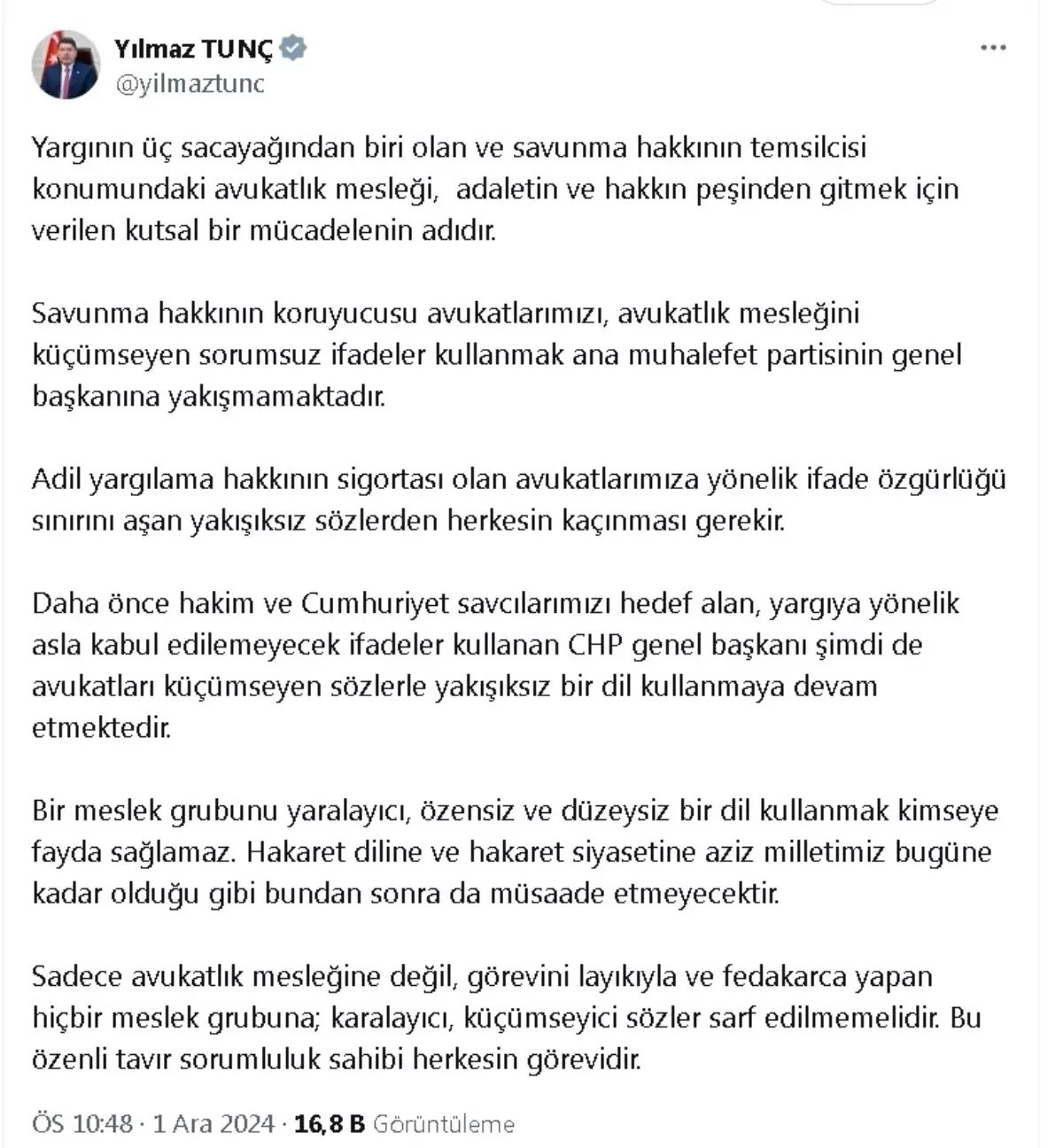 ADALET Bakanı Yılmaz Tunç, “Cumhuriyet savcılarımızı hedef alan, yargıya yönelik asla kabul edilemeyecek ifadeler kullanan CHP genel başkanı şimdi de avukatları küçümseyen sözlerle yakışıksız bir dil kullanmaya devam etmektedir” dedi.