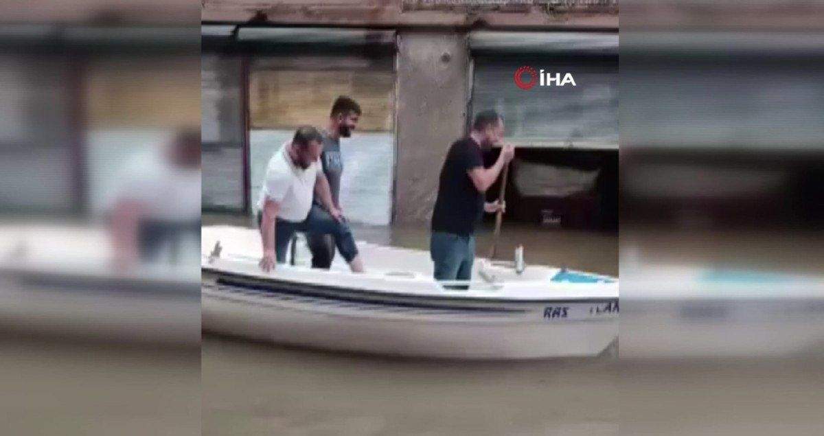 Adana’da şiddetli yağış nedeniyle su basan sokakta bazı vatandaşlar kayıkla gezip o anları sosyal medyada paylaştı.