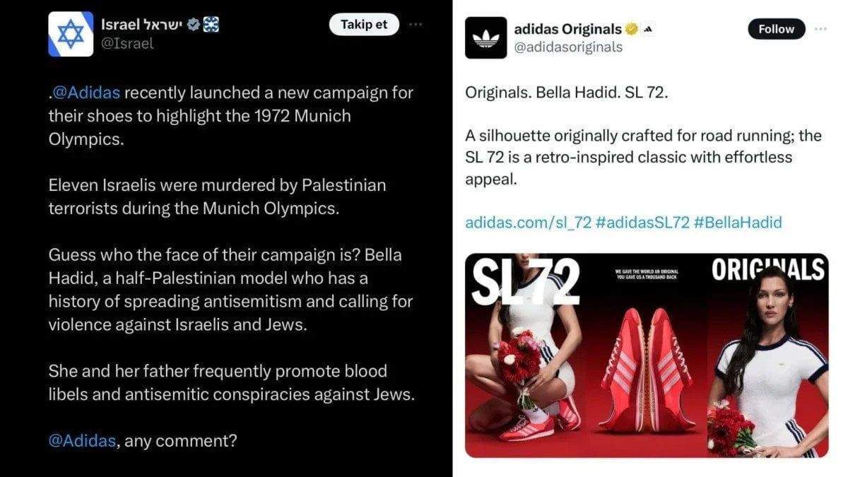 İsrail yanlıları, ünlü modelin Adidas’ın kampanya yüzü olmasına tepki göstermişti. İsrail’in Almanya büyükelçiliğinin resmi X hesabından yapılan açıklamada, “Bilin bakalım kampanyanın yüzü kim? Bella Hadid, geçmişinde antisemitizmi yayan ve İsraillilere ve Yahudilere karşı şiddet çağrısı yapan Filistin kökenli bir model.” ifadeleri yer almıştı.