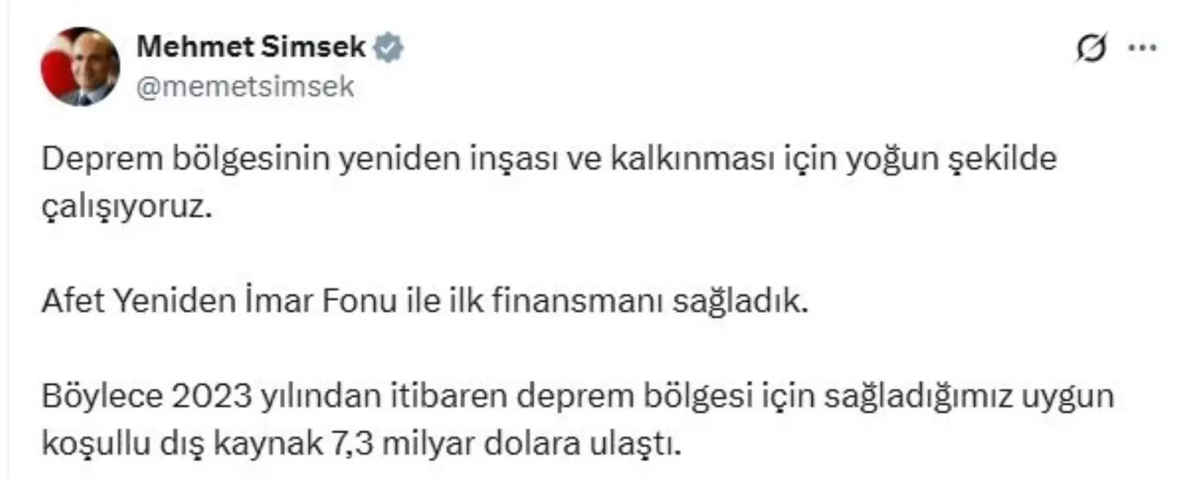 Hazine ve Maliye Bakanı Mehmet Şimşek, sosyal medya hesabından yaptığı açıklamada, “Deprem bölgesinin yeniden inşası ve kalkınması için yoğun şekilde çalışıyoruz. Afet Yeniden İmar Fonu ile ilk finansmanı sağladık. Böylece 2023 yılından itibaren deprem bölgesi için sağladığımız uygun koşullu dış kaynak 7,3 milyar dolara ulaştı” dedi.