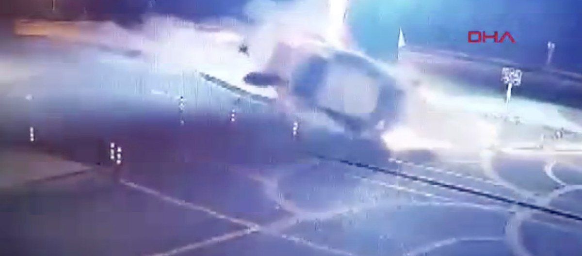 Kaza anı güvenlik kamerasına yansıdı. Görüntüde, kontrolden çıkan otomobilin savrulup reklam panosuna, ardından takla atıp, park halindeki otomobile çarparak durduğu anlar yer aldı.
