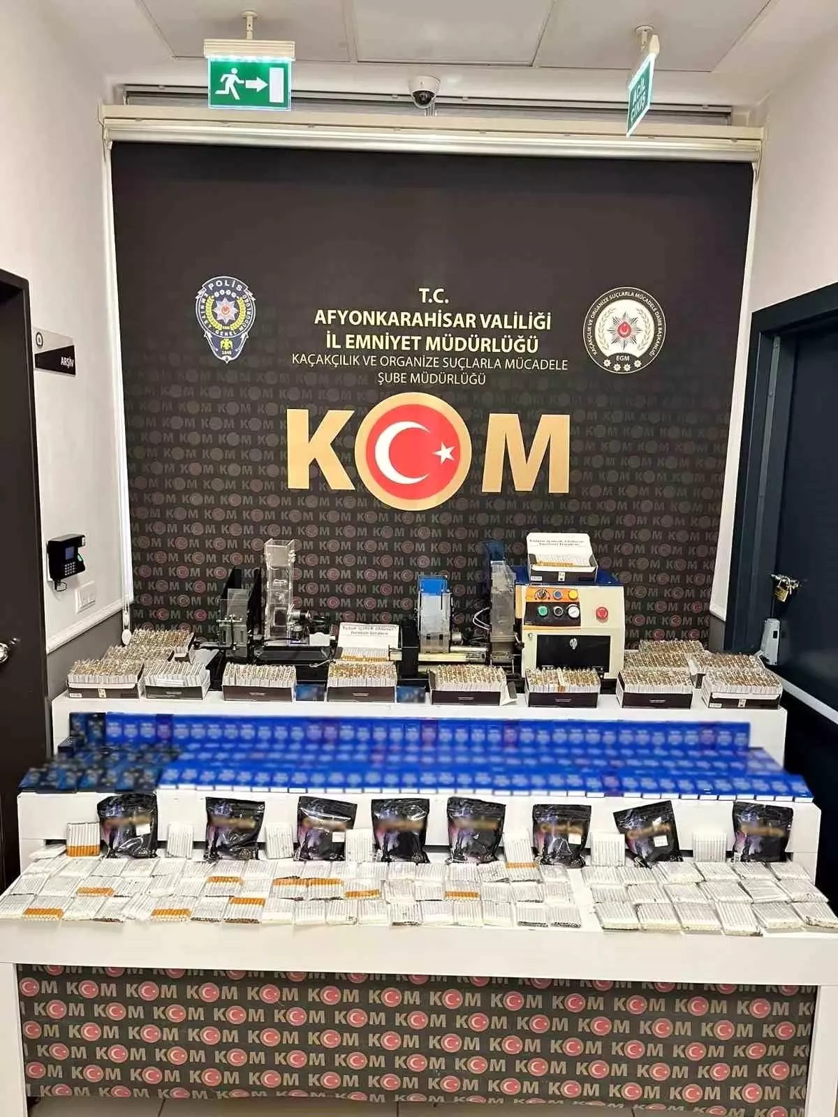 Afyonkarahisar’da polis ekiplerince 2 adet sigara doldurma makinesi, 11 bin 500 adet doldurulmuş makaron ve 4 kilogram nargile tütünü ele geçirilirken, 2 şüpheliye işlem yapıldı.
