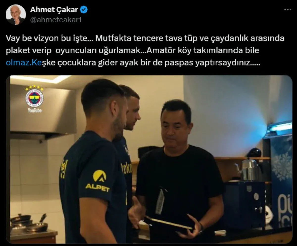 Fenerbahçe’yi eleştiren Ahmet Çakar, “Vay be vizyon bu işte… Mutfakta tencere tava tüp ve çaydanlık arasında plaket verip oyuncuları uğurlamak… Amatör köy takımlarında bile olmaz. Keşke çocuklara gider ayak bir de paspas yaptırsaydınız…” ifadelerini kullandı.