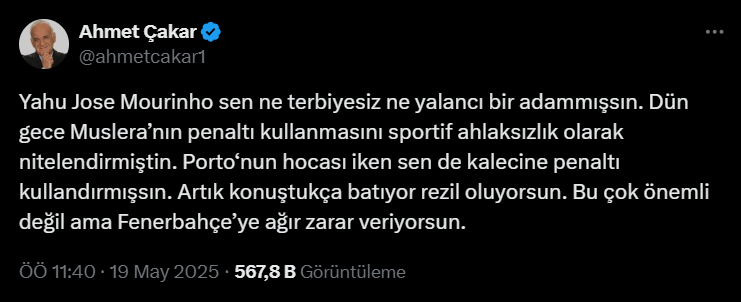 Mourinho’nun sözleri kısa sürede gündem olurken Ahmet Çakar’dan Portekizli teknik adamı zorda bırakacak bir paylaşım geldi.