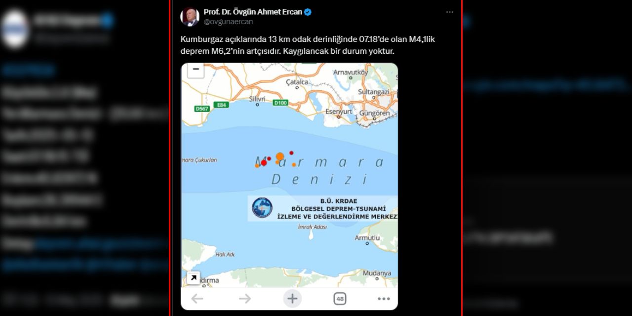 Depremin ardından sosyal medyasından paylaşımlar yapan Ahmet Ercan, önce “Kumburgaz açıklarında 13 km odak derinliğinde 07.18’de olan M4,1lik deprem M6,2’nin artçısıdır. Kaygılanacak bir durum yoktur.” değerlendirmesini yaptı sonra ilgili kuruluşlara yüklendi.