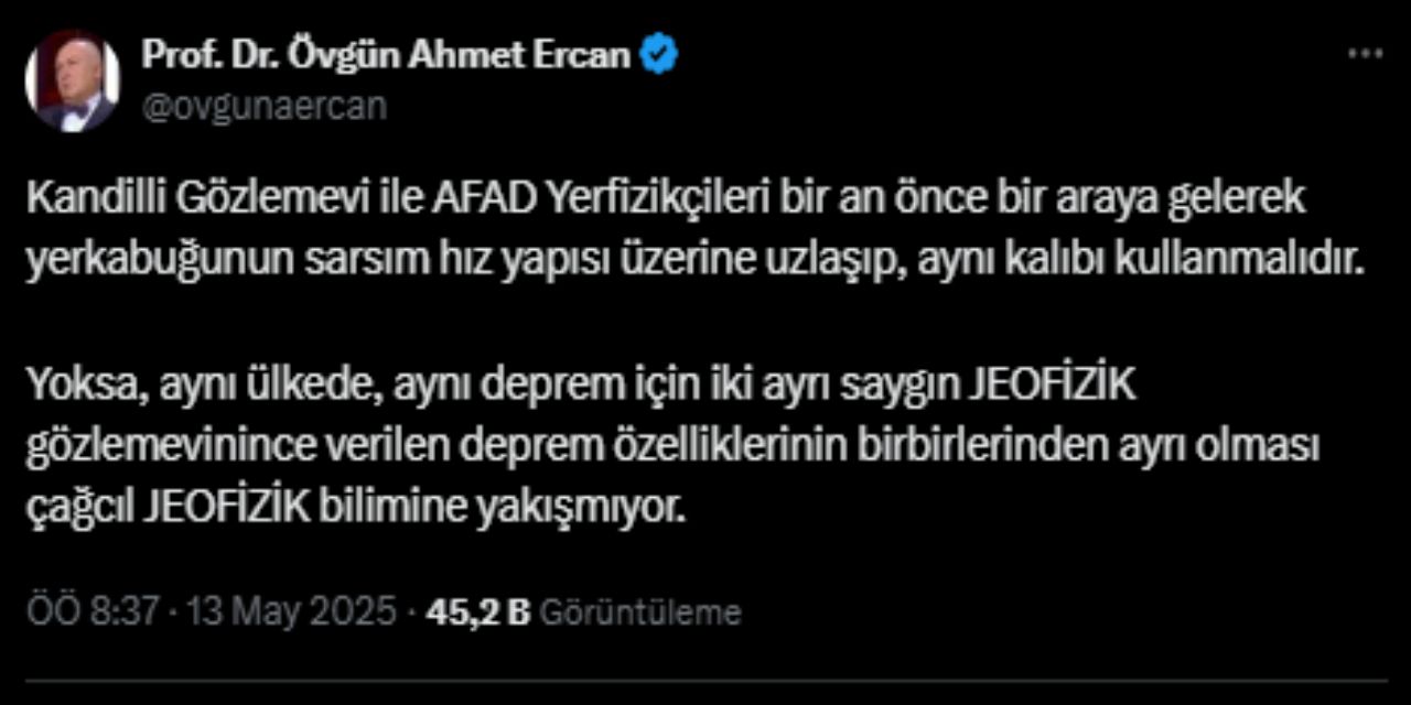 “Kandilli Gözlemevi ile AFAD yerfizikçileri bir an önce bir araya gelerek yerkabuğunun sarsım hız yapısı üzerine uzlaşıp, aynı kalıbı kullanmalıdır.
