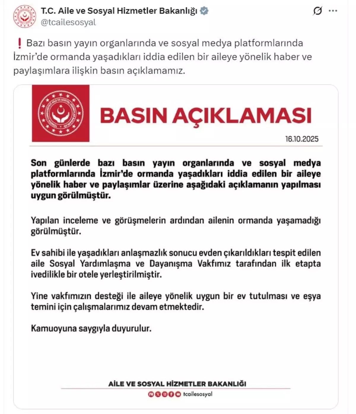 Bakanlığın sosyal medya hesabından yapılan açıklamada, “Son günlerde bazı basın yayın organlarında ve sosyal medya platformlarında İzmir’de ormanda yaşadıkları iddia edilen bir aileye yönelik haber ve paylaşımlar üzerine aşağıdaki açıklamanın yapılması uygun görülmüştür. Yapılan inceleme ve görüşmelerin ardından ailenin ormanda yaşamadığı görülmüştür. Ev sahibi ile yaşadıkları anlaşmazlık sonucu evden çıkarıldıkları tespit edilen aile, Sosyal Yardımlaşma ve Dayanışma Vakfımız tarafından ilk etapta ivedilikle bir otele yerleştirilmiştir. Yine vakfımızın desteği ile aileye yönelik uygun bir ev tutulması ve eşya temini için çalışmalarımız devam etmektedir” denildi.
