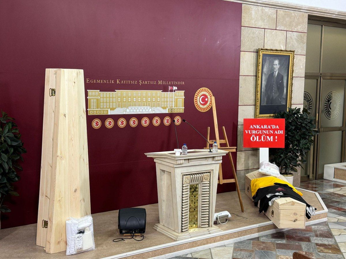 Ayrıca tabut, ceset torbaları ve kefenin konulduğu yerde bulunan “Ankara’da vurgunun adı ölüm!” yazısı da dikkat çekti.