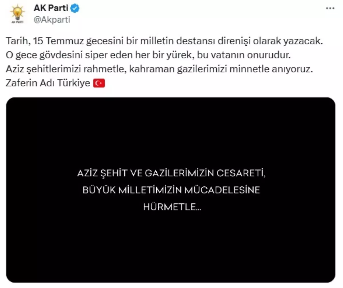 Partinin sosyal medya hesabından, 15 Temmuz Demokrasi ve Milli Birlik Günü’nün 9’uncu yıl dönümü dolayısıyla hazırlanan video mesaj paylaşıldı. Yapılan açıklamada ise, “Tarih, 15 Temmuz gecesini bir milletin destansı direnişi olarak yazacak. O gece gövdesini siper eden her bir yürek, bu vatanın onurudur. Aziz şehitlerimizi rahmetle, kahraman gazilerimizi minnetle anıyoruz” denildi.