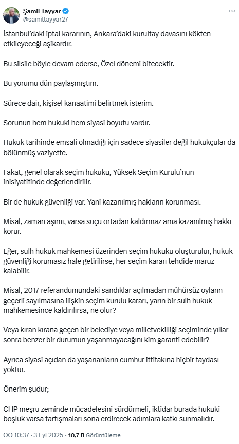 Siyaset gündeminin ilk sırasına oturan mahkeme kararına ilişkin olarak AK Partili Şamil Tayyar’dan kendi partisine uyarı geldi. 2017 yılında yapılan referandumdaki “mühürsüz oy” kararını hatırlatan eski AK Partili Milletvekili Tayyar, X hesabından yaptığı paylaşımda şunları kaydetti: “İstanbul’daki iptal kararının, Ankara’daki kurultay davasını kökten etkileyeceği aşikardır. Bu silsile böyle devam ederse, Özel dönemi bitecektir. Bu yorumu dün paylaşmıştım. Sürece dair, kişisel kanaatimi belirtmek isterim.