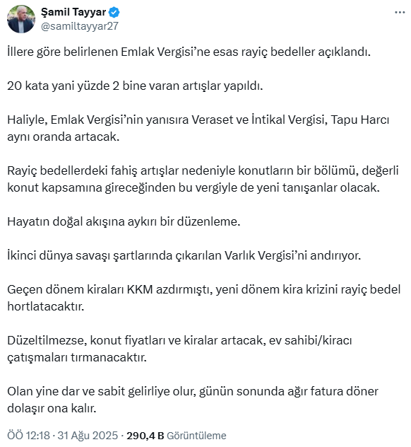 AK Partili Şamil Tayyar, illere göre belirlenen Emlak Vergisi'ne esas rayiç bedellere tepki gösterip "Konut fiyatları ve kiralar artacak, ev sahibi/kiracı çatışmaları tırmanacaktır. Olan yine dar ve sabit gelirliye olur, günün sonunda ağır fatura döner dolaşır ona kalır" uyarısında bulundu.