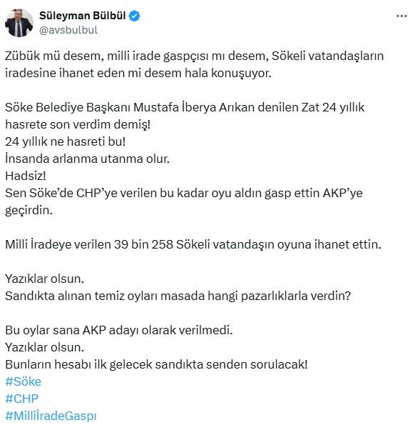 Sosyal medya hesabından açıklama yapan CHP Aydın Milletvekili Süleyman Bülbül, Arıkan’a zehir zemberek sözlerle yüklendi. Bülbül, şunları söyledi: “Zübük mü desem, milli irade gaspçısı mı desem, Sökeli vatandaşların iradesine ihanet eden mi desem hala konuşuyor. Söke Belediye Başkanı Mustafa İberya Arıkan denilen Zat 24 yıllık hasrete son verdim demiş! 24 yıllık ne hasreti bu! İnsanda arlanma utanma olur. Hadsiz!