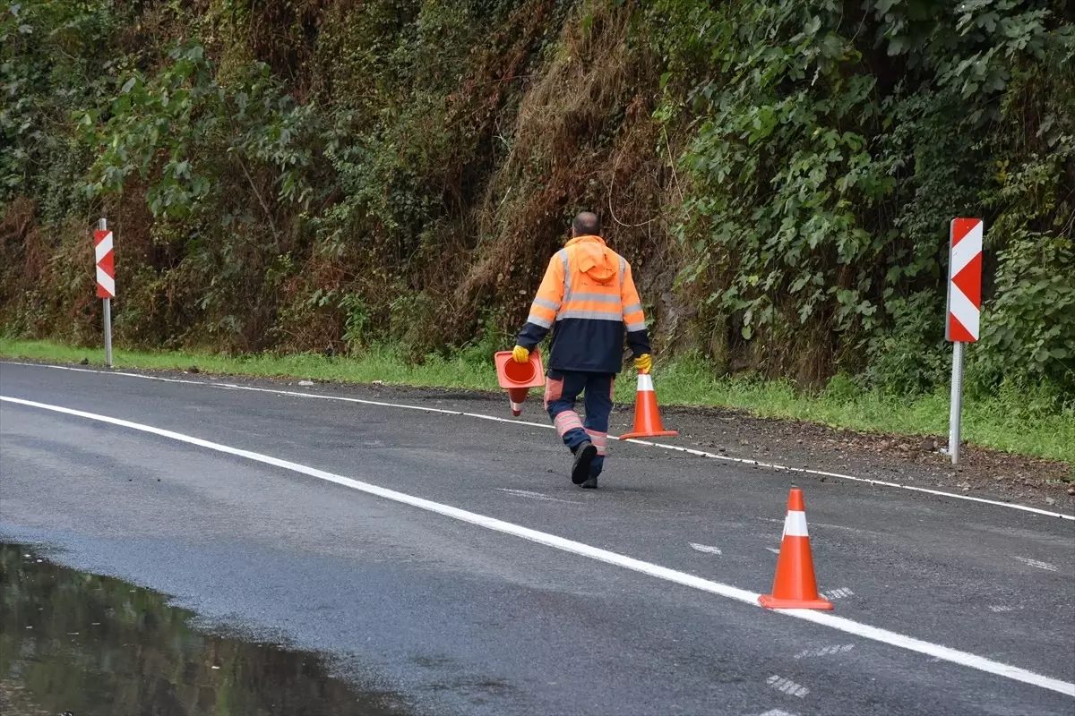Sera Gölü yolunda toprak kayması nedeniyle ulaşım tek şeritten sağlanıyor, temizlik çalışmaları devam ediyor.