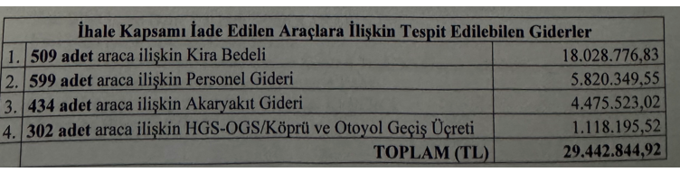 Öte yandan araçların yakıt, şoför, HGS ücretlerinin de belediyeden ödendiği belirlendi. Buna göre İBB adına kiralanan ve AKP’ye yakın kurumlar ve AKP’ye tahsis edilen araçların 5 milyon 820 bin liralık şoför, 4 milyon 475 bin liralık yakıt, 1 milyon 118 bin liralık HGS masrafları İBB’den karşılandı. İBB bütçesinden 5 aylık süreçte kira bedeli olarak ise 18 milyon 29 bin lira ödendi. CHP’nin adayı Ekrem İmamoğlu’nun seçimleri kazanması ile bir yıllık sözleşme ve ek masraflar ile kamu zararının daha fazla yükselmesi önlendi ve araçların gönderildikleri yerlerden geri alındı ve firmaya iade edildi. Böylece 5 aylık 29 milyon 442 bin liralık zarardan daha fazlasının oluşmaması sağlandı. İhalenin yapıldığı dönemde dolar kuru 5 lira 20 kuruştu. Bu da, İBB bütçesinin yaklaşık 6 milyon dolar zarara uğratıldığını ortaya koyuyor.