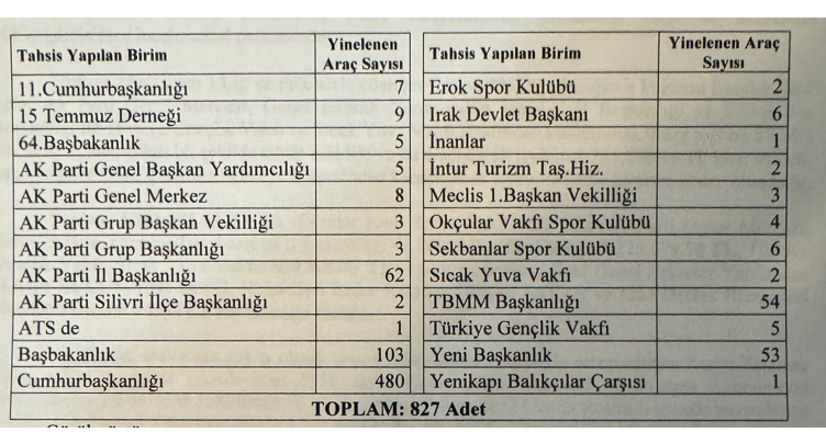 Yapılan denetimlerde, kiralanan 2 binden fazla aracın 827 tanesinin açıkça mevzuata aykırı şekilde üçüncü kişi ve kurumlara tahsis edildiği belirlendi. Tahsis edilen kurumlar arasında AKP Genel Merkezi ve Genel Başkan Yardımcıları, AKP İstanbul İl Başkanlığı, AKP Silivri İlçe Başkanlığı, Türkiye Gençlik Vakfı (TÜGVA), Sıcak Yuva Vakfı, Esenler Erokspor (Misli.com 3. Lig takımı), 15 Temmuz Derneği, 11’inci Cumhurbaşkanlığı, 64’üncü Başbakanlık, AKP Grup Başkanvekilliği, AKP Grup Başkanlığı, Başbakanlık, Irak Devlet Başkanı, Okçular Vakfı gibi siyasi ve sivil yapılanmalar yer aldı. Belediyeye ait araçlar bu kurumların kullanımına sunulurken, bu araçların tüm kira, şoför, yakıt, HGS/OGS giderleri doğrudan İBB bütçesinden karşılandı.