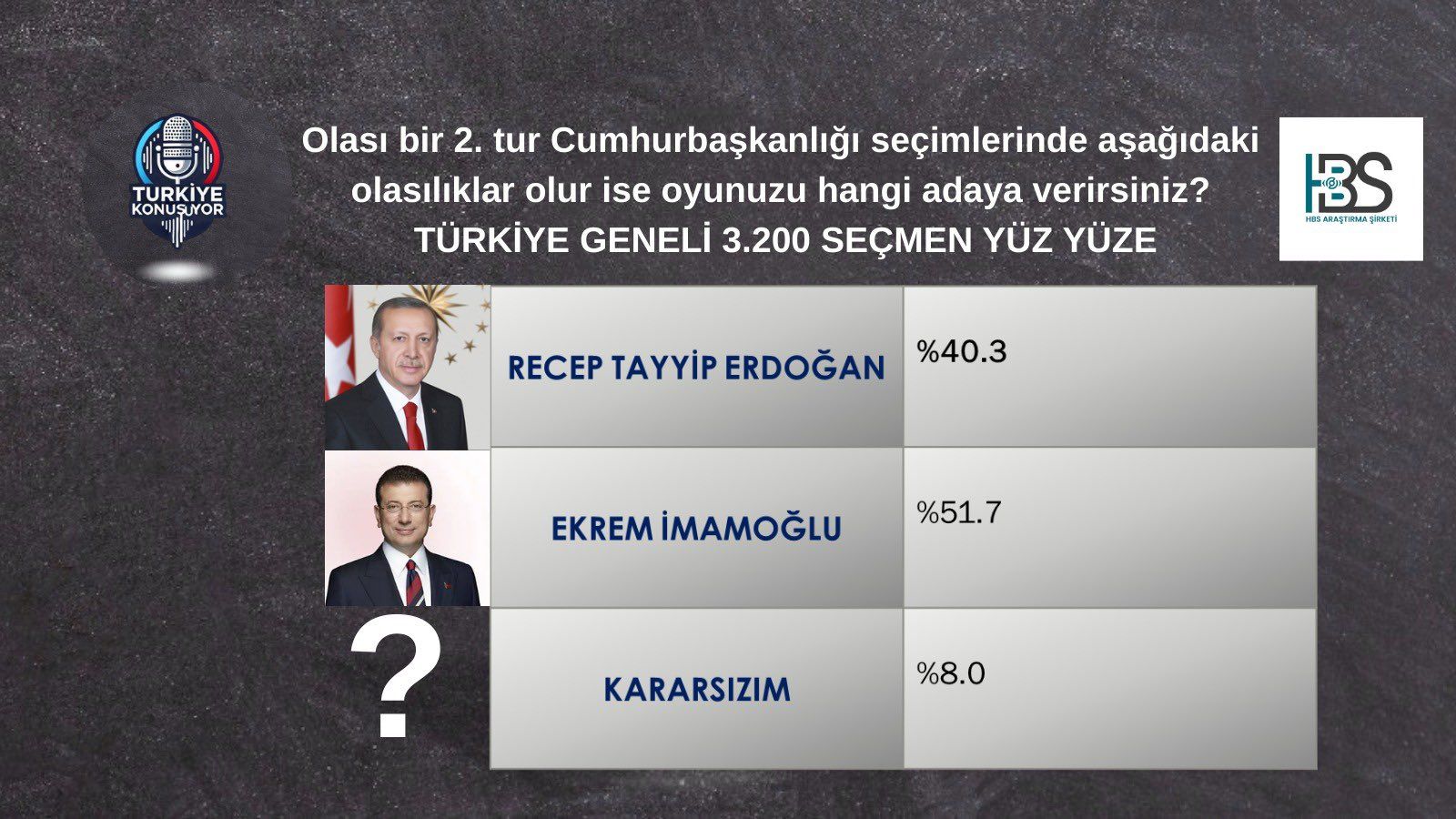 4 Farklı anket sonucu paylaşan HBS, ilk anketinde katılımcılara Cumhurbaşkanı ve AKP Genel Başkanı Recep Tayyip Erdoğan, İBB Başkanı ve Cumhurbaşkanı adayı Ekrem İmamoğlu’nun yer aldığı, “Olası bir 2. tur Cumhurbaşkanlığı seçimlerinde aşağıdaki olasılıklar olur ise oyunuzu hangi adaya verirsiniz?” sorusunu yöneltti.