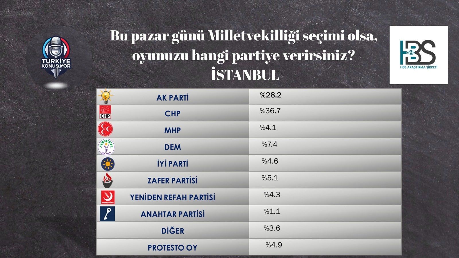 Ankete katılan katılımcıların “yüzde 36.7’sı” CHP’ye oy vereceğini belirtirken, AKP’ye oy vereceğini belirtenlerin oranı “yüzde 28.2’de” kaldı.