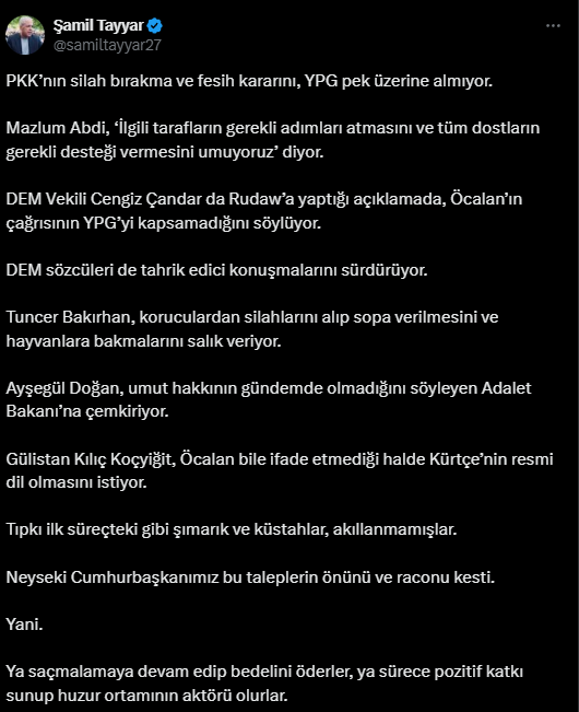AKP’nin sembol isimlerinden olan eski milletvekili Şamil Tayyar, sosyal medya hesabından devam eden ‘süreç‘ üzerine dikkat çeken açıklamalarda bulundu. Mazlum Abdi‘nin açıklamalarının yanında DEM’li milletvekili Cengiz Çandar‘ın Rudaw’a yaptığı açıklamalar, Tuncer Bakırhan’ın korucular üzerine kullandığı ifadeler, Ayşegül Doğan‘ın umut hakkı üzerine Adalet Bakanı‘na verdiği yanıt ve Gülistan Koçyiğit‘in Kürtçe’nin ana dil olması üzerine söylemleri.