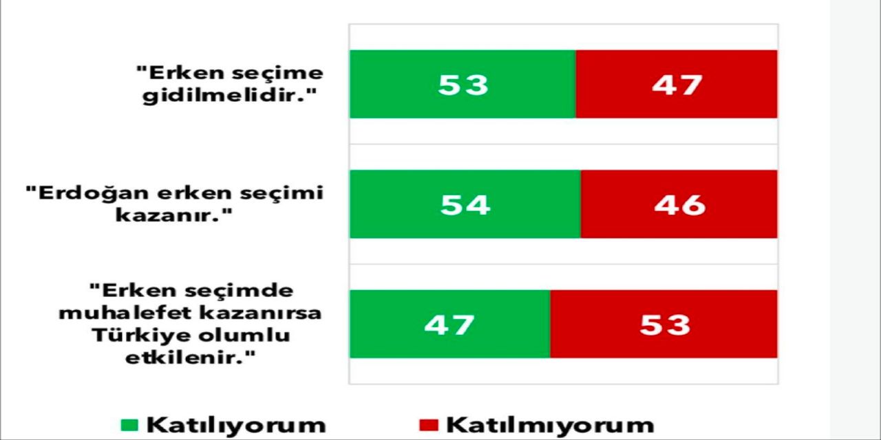 Erken seçime dair fikirleri de sorulan Yozgatlıların yüzde 53’ü erken seçime gidilmesi gerektiği yönünde yanıt verdi. ‘Erken seçim olursa Erdoğan kazanır’ diyenlerin oranı yüzde 54, kazanamaz’ diyenlerin oranı ise yüzde 46 olarak ölçüldü. ‘Muhalefet kazanırsa Türkiye olumlu etkilenir’ diyenlerin oranının da yüzde 47 olduğu görüldü.