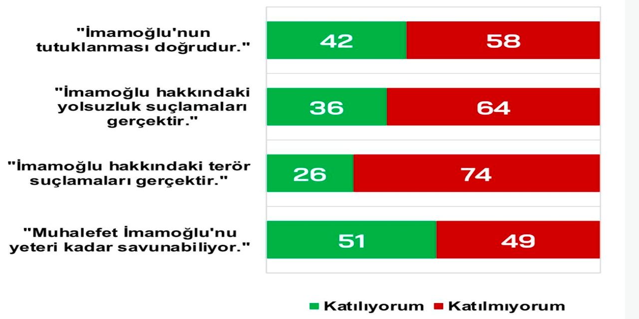 -İmamoğlu hakkındaki yolsuzluk suçlamalarının gerçek olduğunu düşünenlerin oranı yüzde 36 olarak ölçülürken yüzde 64 suçlamaların gerçek olmadığını düşündüğünü ifade etti.